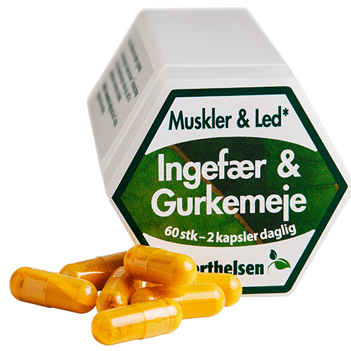 Vegansk kosttilskud med ingefær og gurkemeje, støtter led, muskler og immunforsvar. Fri for tilsætningsstoffer. Dansk kvalitet – 60 kapsler til 30 dage.