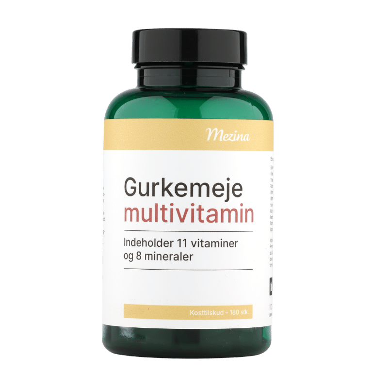 Få et dagligt tilskud af vitaminer og mineraler med Mezina Gurkemeje + Multivitamin. Dette kosttilskud kombinerer gurkemeje med 11 essentielle vitaminer og 8 mineraler, som en del af en varieret og afbalanceret kost.